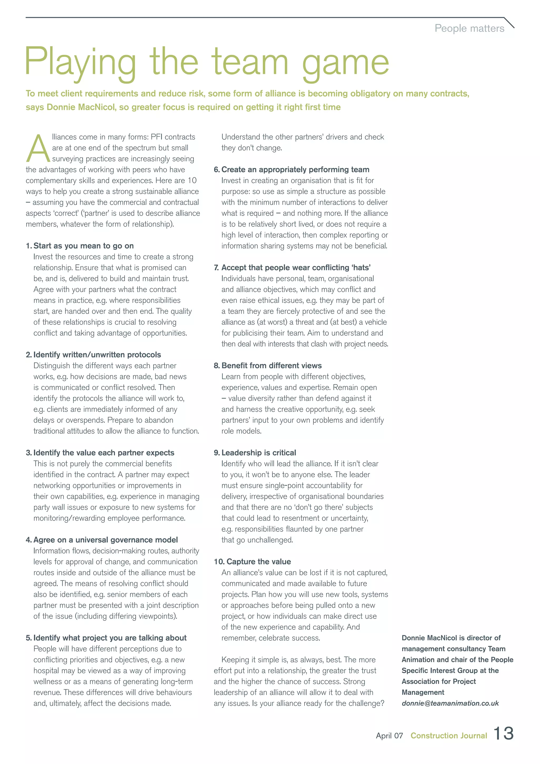 The document outlines key strategies for building strong alliances in construction projects to meet client needs and reduce risks. It emphasizes the importance of trust, effective communication, leadership, and understanding each partner's objectives while encouraging open-minded collaboration and conflict resolution. The text offers ten actionable guidelines for creating sustainable alliances, underscoring that the investment in relationships leads to greater chances of success.