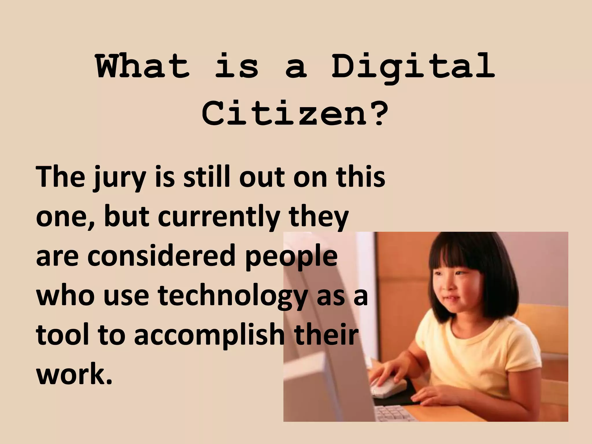 The document discusses the importance of developing effective digital citizens through digital literacy education. It argues that students today struggle with information overload and need to be taught critical thinking and evaluation skills to make sense of the vast amounts of information available online. The document advocates getting digital literacy into school curriculums to prepare students to be active participants in the digital world and teach them skills like searching, communicating, collaborating, and creating online communities.