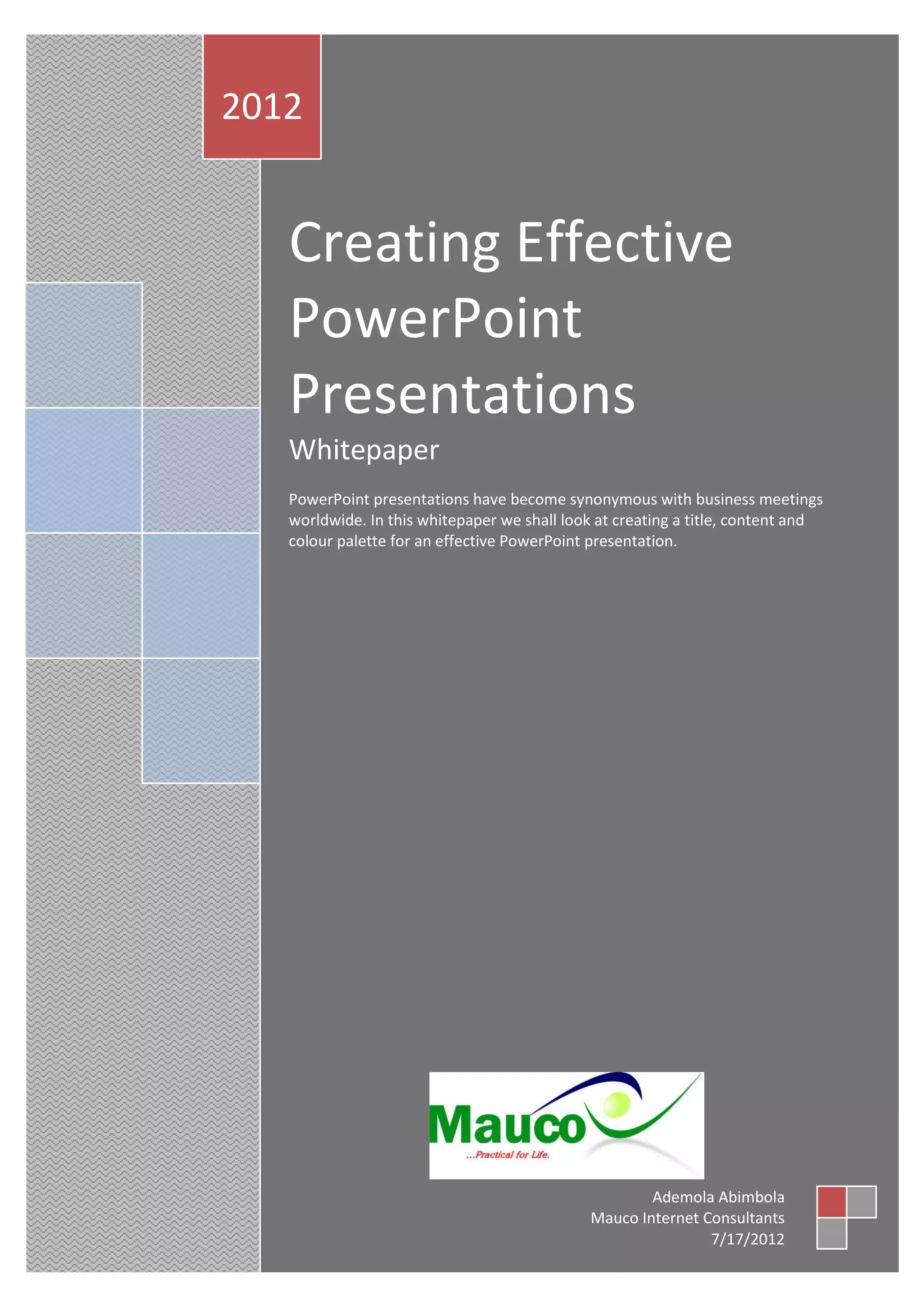 The document provides guidance on creating effective PowerPoint presentations. It discusses including a short, straightforward title that identifies the presenter, audience and date. The content of slides should have 5 or fewer bullet points that replace text with pictures and video when possible. Choosing a suitable color palette and providing speaker notes to support slides are also addressed. The document was created by Mauco Internet Consultants to help businesses in Nigeria develop presentations.
