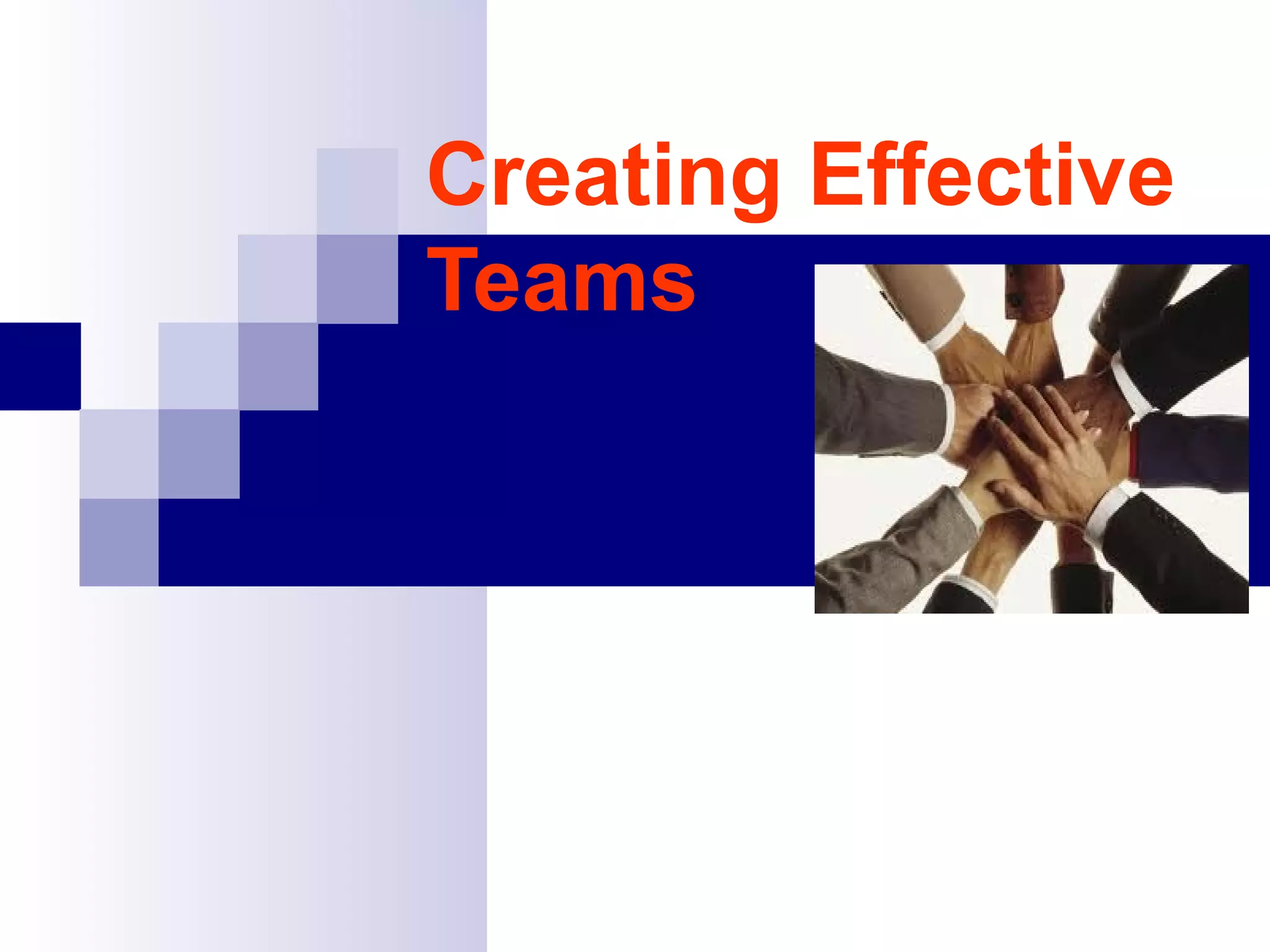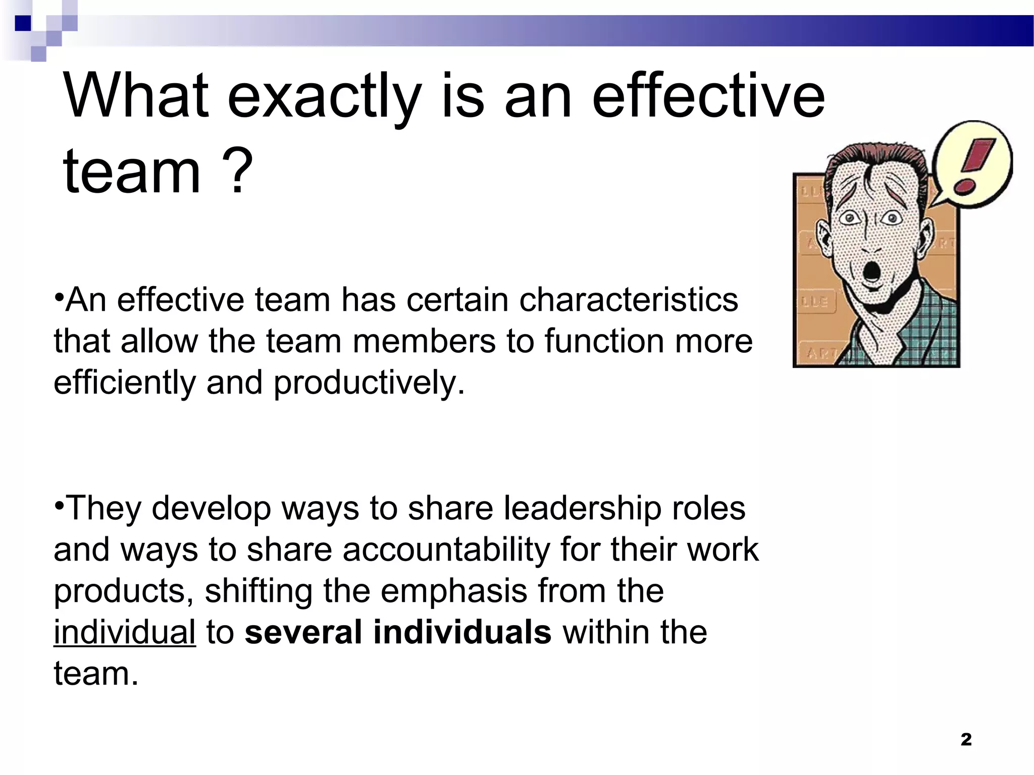 An effective team has shared leadership, develops their own scope of work and commits time to complete tasks. Team members are mutually accountable for work products and individual performance is based on team achievements. The document discusses how to create effective teams by sharing leadership roles, developing accountability, scheduling work, and creating work products together. It also outlines the stages teams typically go through, from initially forming to storming, norming, and high performing. Qualities of a good leader are described as supporting the team and prioritizing both people and production.