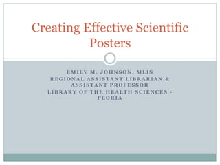 This document provides guidance on creating effective scientific posters. It discusses key elements like having a single, focused message; using graphics to tell the story; and having a well-ordered sequence. The planning process involves knowing conference rules and judging criteria, choosing a layout, and editing text carefully. Effective layout avoids clutter, uses simple lettering and colors, and doesn't fight reader gravity. Presenters should bring a poster hanging kit, extra copies, and business cards when presenting and be prepared to discuss their work.