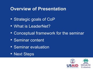 This document summarizes a seminar on creating an enabling environment for monitoring and evaluation communities of practice. The seminar's goals were to disseminate organizational development approaches and materials, share field practices, and create a sharing platform. Over five days, the seminar covered topics like organizational capacity frameworks, fostering enabling environments, and case studies. Participants learned strategies for strengthening monitoring and evaluation systems. Next steps include forming a community of practice and providing ongoing learning opportunities to keep participants engaged on topics.