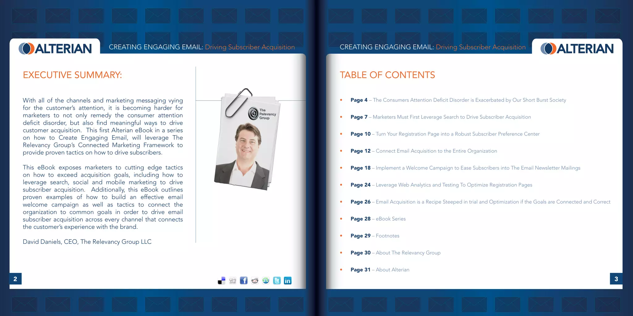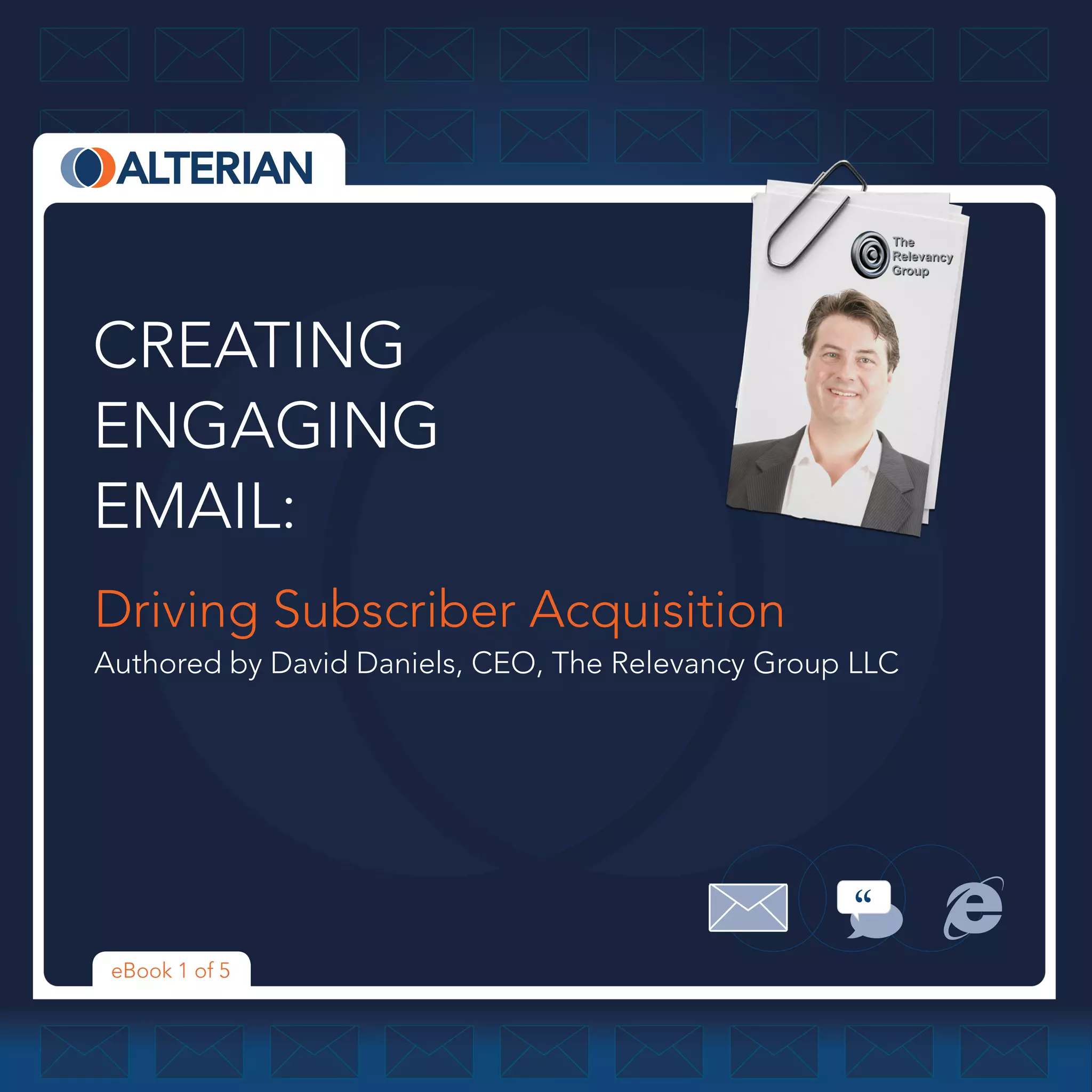 The document is an ebook titled 'Creating Engaging Email: Driving Subscriber Acquisition' by David Daniels, which provides marketers with strategies to capture consumer attention in a fragmented media landscape. It outlines tactics for leveraging various channels like search, social, and mobile marketing to enhance email subscriber acquisition, emphasizing the importance of relevant and engaging content. The ebook also introduces the concept of a welcome campaign and integrated marketing efforts to build a successful subscriber base across all organization channels.