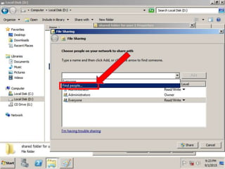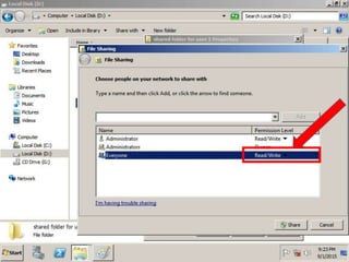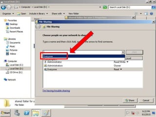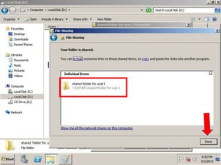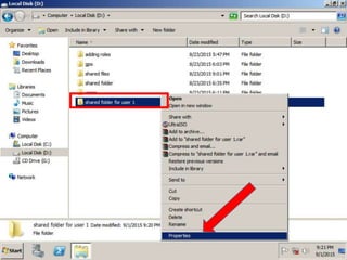 The document provides instructions for creating a shared folder on drive D:, then using Group Policy to redirect all user folders to that shared location. The steps are to create a new folder on D:, open Group Policy Management, create a new GPO linked to the domain, name the GPO and edit it, navigate to User Configuration > Policies > Windows Settings > Folder Redirection, right click and select properties, choose the option to redirect everyone's folder to the same location and create a subfolder for each user under that path.