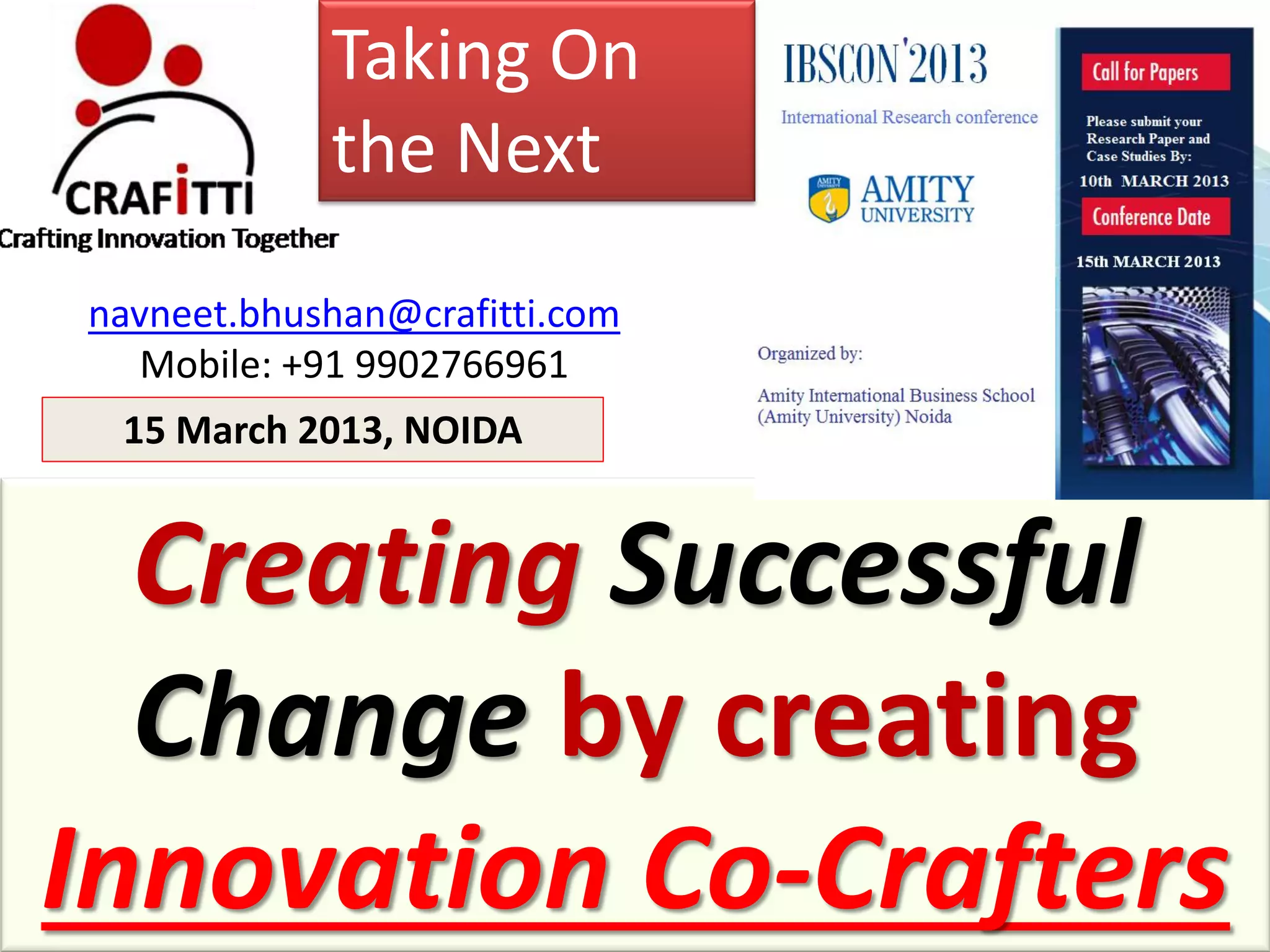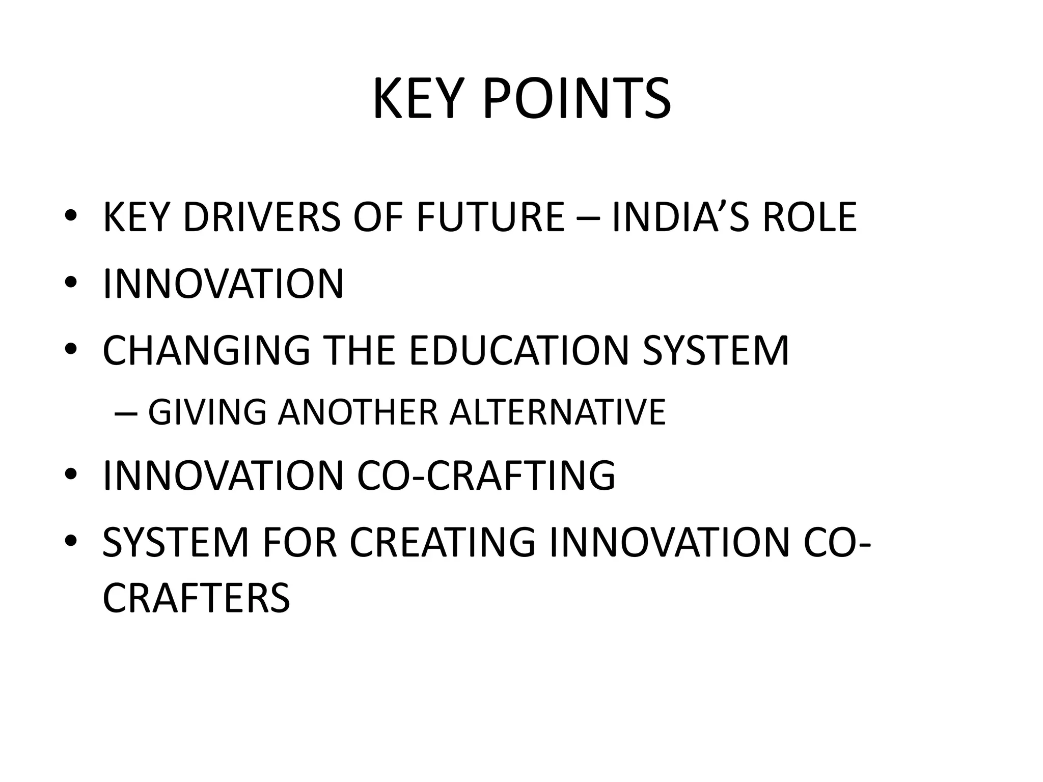 This document discusses the need for innovation in India to capitalize on its demographic dividend over the next 25 years. It argues that India needs to change its education system to foster more innovators and entrepreneurs. The document proposes an "Innovation Co-Crafting" system to help nurture innovation skills in students. It advocates teaching concepts like invention, innovation, creativity and decision making. The goal is to train students to become inventors, innovators and entrepreneurs rather than just learning traditional academic subjects.