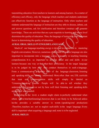 This document discusses language of instruction and developing listening and speaking skills in a second language. It addresses several key points: