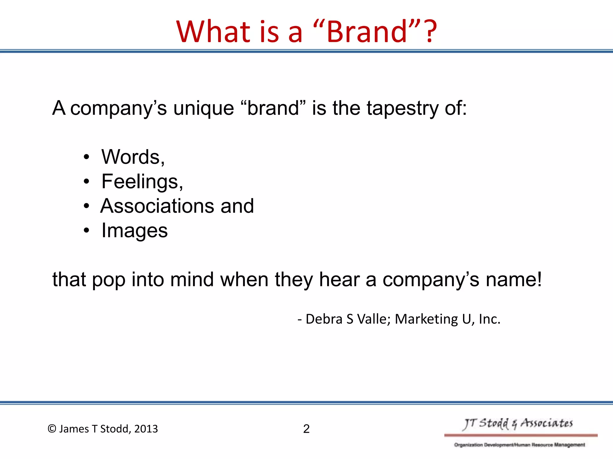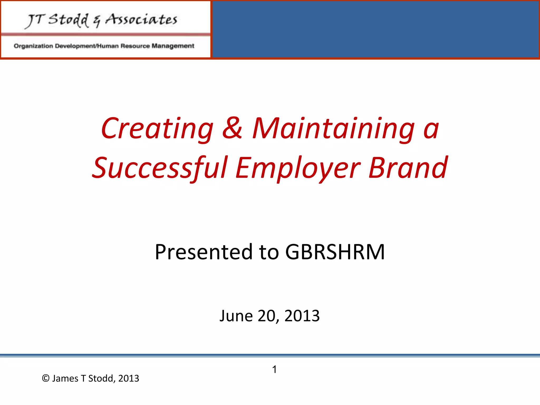 The document discusses creating and maintaining a successful employer brand. It defines a brand as the words, feelings, associations and images that come to mind when a company is mentioned. Great brands generate trust, loyalty, passion and pride, and communicate quality products/services, customer service and reputation. All great brands start with the customer experience. The document provides 10 steps to building a great brand, including articulating mission and values, understanding strengths/weaknesses, establishing brand objectives and promises, and ensuring behaviors align with the brand promise.