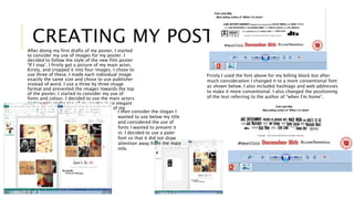 The document discusses the process of creating ancillary products for a film project, including a poster, logo, and film magazine. For the poster, the creator cropped an image of the main actor into multiple sizes and positioned them at the top. Fonts and colors were chosen to convey the genre. The logo was made in Photoshop using layers and blur tools. Multiple drafts of the film magazine were made with revisions like additional coverlines, advertisements, and font changes to better match conventions.
