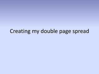 The document describes the process of creating a double page spread for a magazine. First, the main image was added from Photoshop and edited to be brighter. Then a footer with page numbers in a black and red triangle was added. Next, the main article, byline and artist quote were formatted into three columns. The full page image was used to highlight the main feature. Finally, another masthead was added to identify the section for readers.