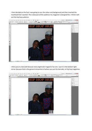 This document summarizes the steps taken to design the front cover of a magazine. The designer cropped an image to fit the page, chose a font and colors suited for a hip hop audience. A barcode was added to the bottom right corner as is conventional. A slogan and cover line were added to draw attention. Teasers and information about the teasers were included to provide more context and appeal to the intended audience. Text was formatted in all caps or small caps to look professional and bold, increasing the chance of attracting readers.