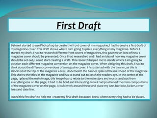 Lucy Morrissey created a first draft magazine cover layout before using Photoshop. This included positioning conventions like the banner, masthead, main image, and other elements. Morrissey then took photos related to the headline for the main image. Feedback was received on the draft to make changes. Photoshop was used to edit images, add text, and finalize the design based on the first draft and feedback. The final cover followed magazine conventions and kept a consistent, professional look.