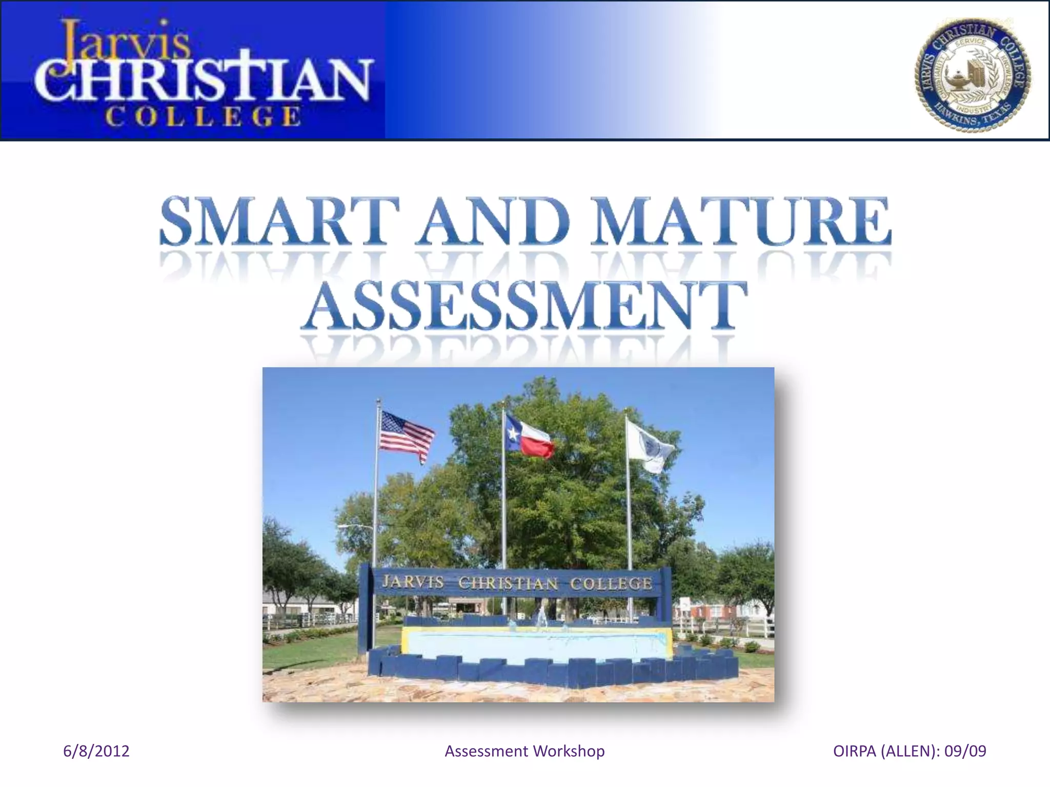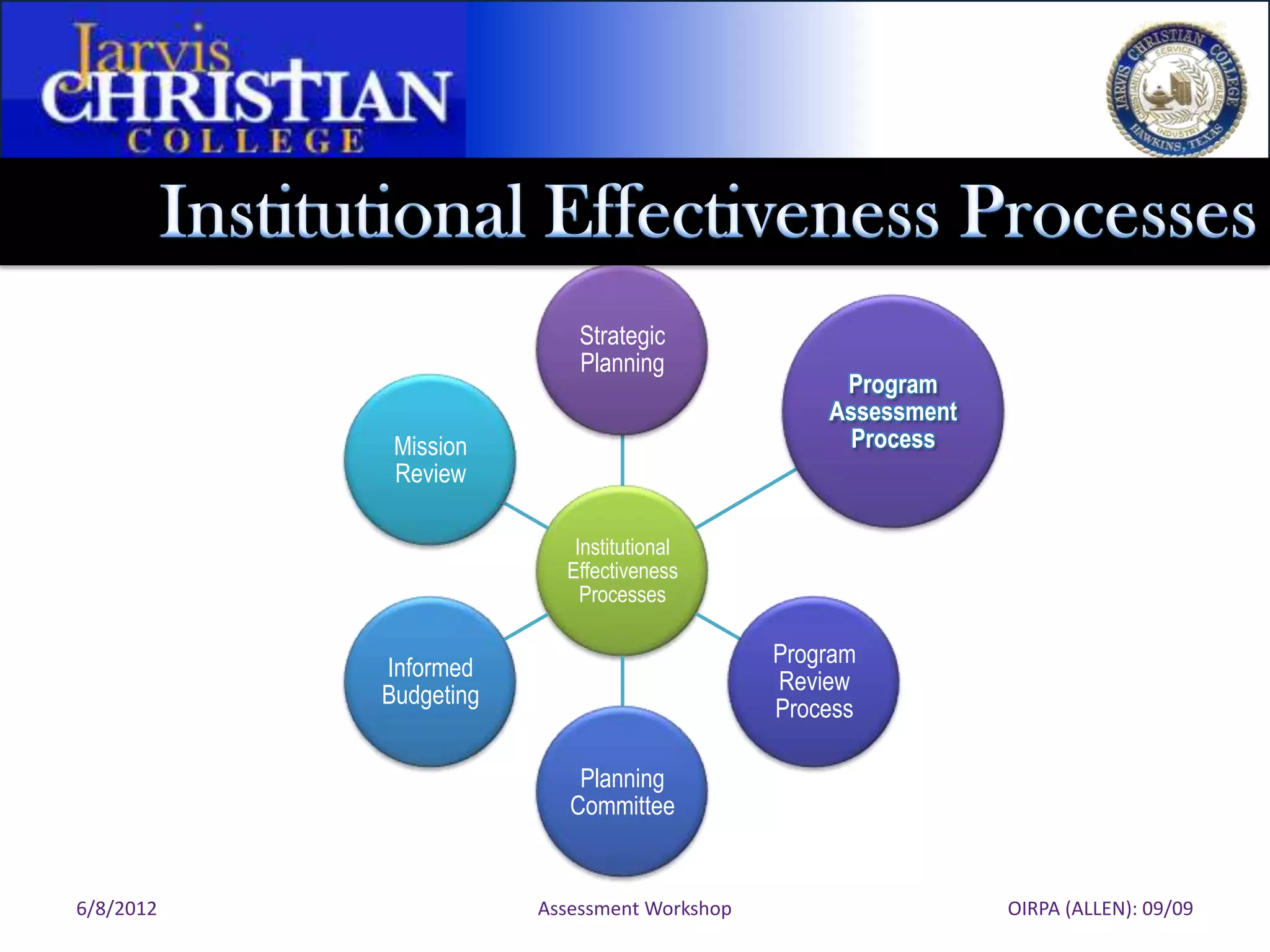 The document outlines the key components of an assessment process, including mission review, program assessment, planning committees, and using assessment results to inform budgeting and program review. It emphasizes that assessment is required at all institutional levels and is part of ensuring overall institutional effectiveness. The goals are to gather information to determine if programs are meeting their goals and then use that data to enhance the programs.