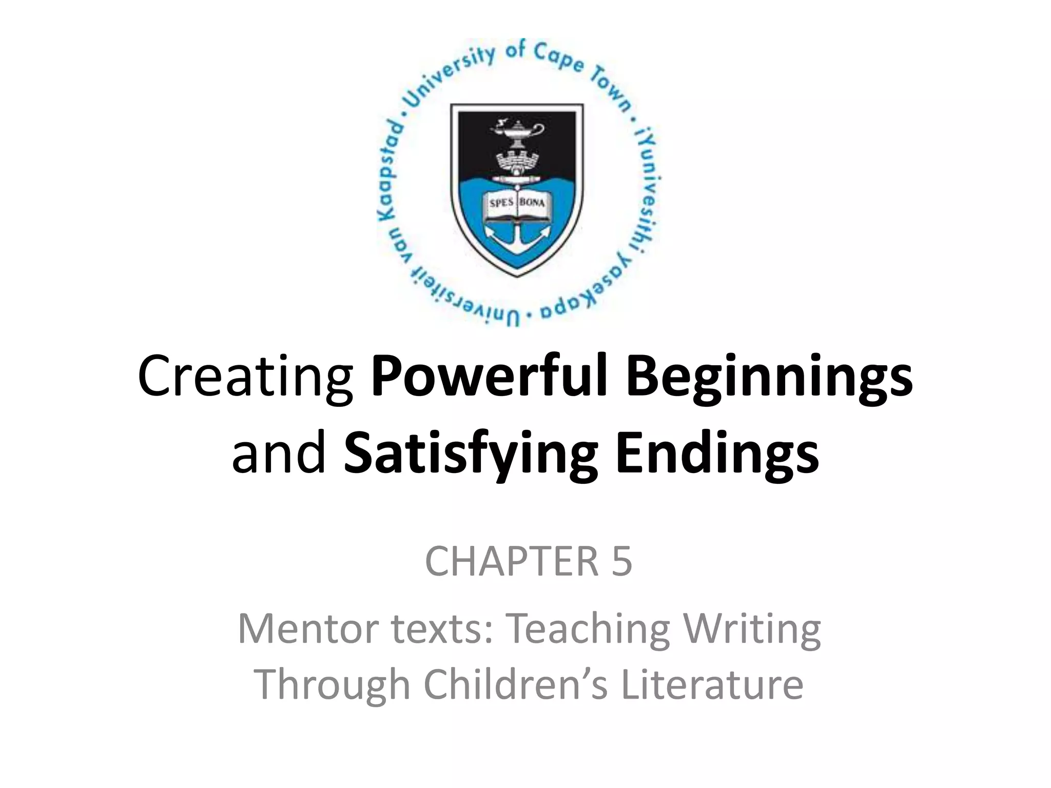 This document discusses creating effective beginnings and endings for stories. It notes that a good story has an enticing beginning to draw the reader in, an interesting middle, and a satisfying ending. It provides an example of a short story called "Shortcut" that effectively uses repetition and brief descriptions. The document also offers techniques for teaching writing skills like using story schemas, asking students to elaborate on their stories, and using pictures to plan stories. Finally, it defines what makes a good beginning, like establishing setting and character, and a good ending, like being satisfying and memorable while connecting to the beginning.