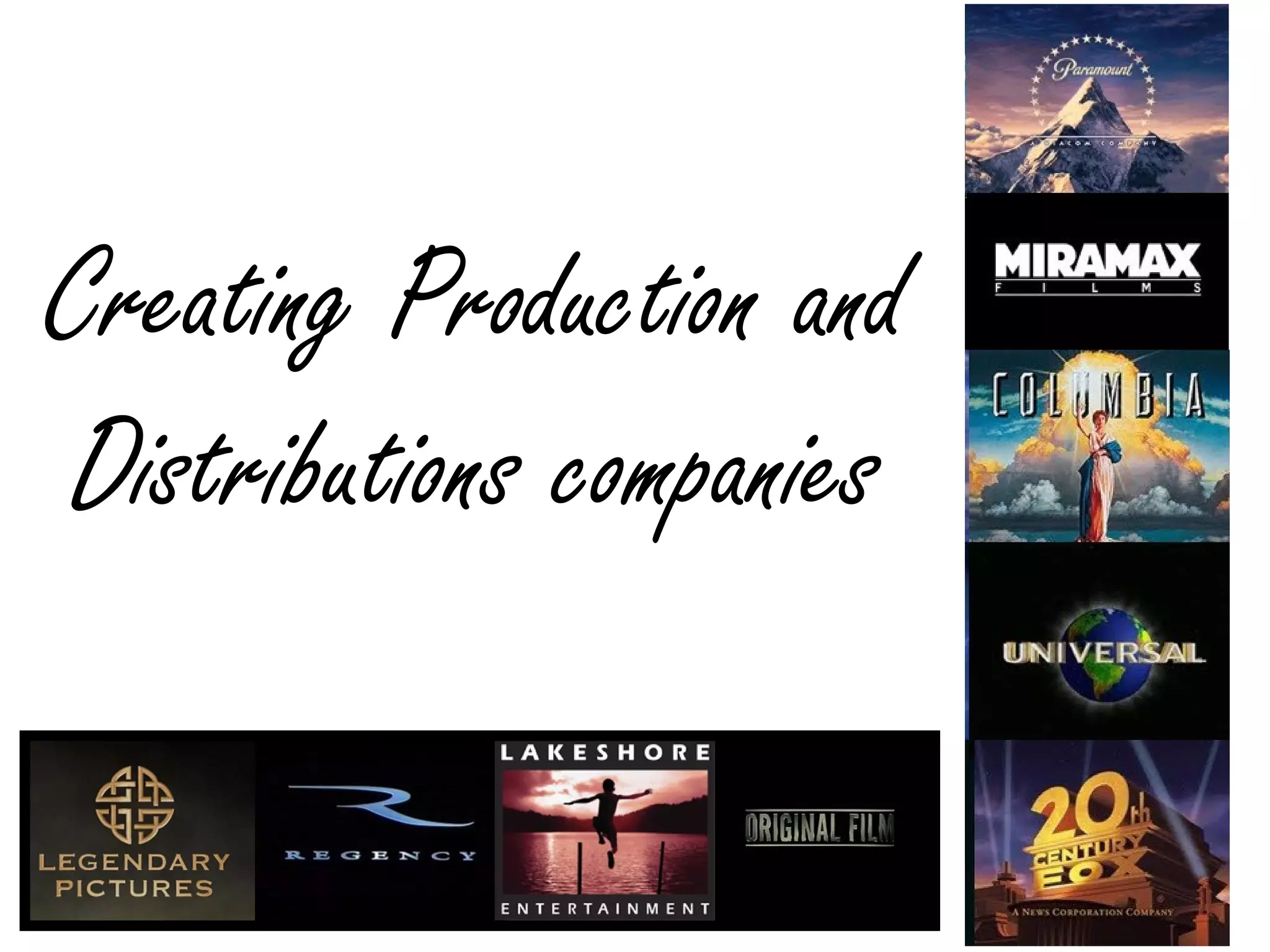 The document describes the process of creating logos for a fictional production and distribution company. It discusses selecting striking images, cropping and editing photos in Photoshop, experimenting with fonts, effects, colors and layouts to develop logos that represent the companies and convey their brand identities. For the distribution company logo, a sunset photo was chosen and text was added with effects to tie the image and text together. For the production company, a simple landscape photo was used and lettering chosen to reflect the name "Happiness Productions."