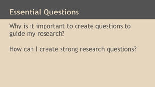 This document discusses how to create effective research questions to guide research. It explains that research questions map out the direction of the research. An effective research question needs information from sources beyond yourself, requires background research, and is neither too broad nor too narrow in scope. There are two types of questions: "thin" questions like who, what, when, where that provide background details, and "thick" questions using how and why that explore broader concepts and changes over time. The document provides examples of each and guides the reader in forming their own thick questions.