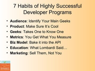 The document outlines 7 habits for creating successful developer programs: 1) Identify your target audience of developers, 2) Ensure your product is appealing to developers and solves their problems, 3) Have developers on your team who understand other developers, 4) Use metrics that are aligned with business goals and incentivize developers, 5) Integrate your business model into your API, 6) Educate developers through code examples and documentation without requiring logins, 7) Market by promoting what developers create rather than the company itself.