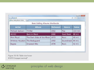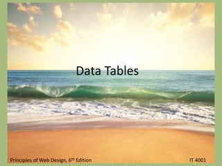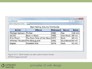 The document outlines objectives for a web design course focused on using HTML table elements effectively, including table headers, footers, and styling techniques such as padding, margins, and background colors. It emphasizes the importance of presenting data clearly with proper styling and interactivity such as hover effects. Additionally, it advises against using tables for page layout while encouraging the use of CSS for enhancing table presentation.