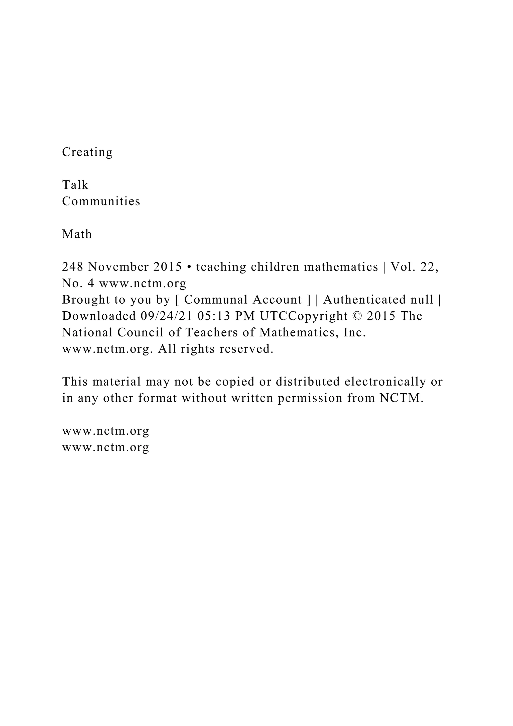 This document discusses the transformation of a fourth-grade math classroom into a math-talk learning community using five strategies to foster meaningful discussions among students. The strategies include teaching the importance of math talk, active listening, sentence stems, contrasting explanation and justification, and providing examples to support student engagement and reasoning. The implementation of these strategies has led to increased cooperation and deeper understanding of mathematical concepts among students.