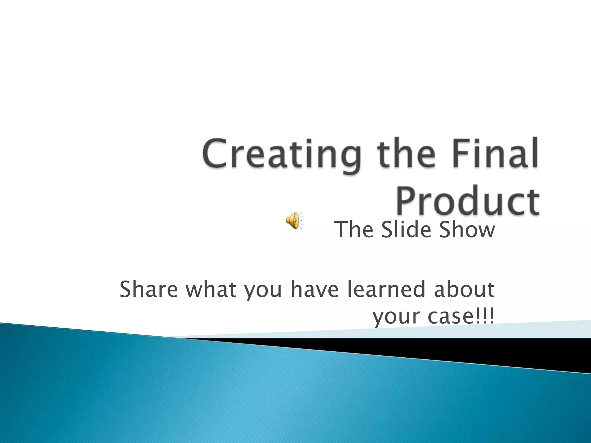 The document provides instructions for creating a slide show presentation in Microsoft PowerPoint to summarize a legal case. It outlines dividing the work among team members, with each person creating one slide on an assigned topic related to the case. The team leader will compile the individual slides into a final presentation. They will then upload the slide show to SlideShare and paste the embed code into the class website to share the finished product with others.