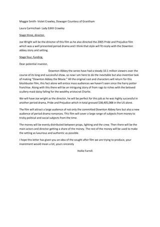 The document outlines a 4 stage process for creating a Downton Abbey movie: [1] The story involves Daisy falling for a wealthy aristocrat while the family struggles with business; [2] It lists the original cast returning; [3] Joe Wright will direct as he successfully directed Pride and Prejudice; [4] A letter seeks funding by emphasizing the large fanbase and period drama appeal, and outlines budget plans.