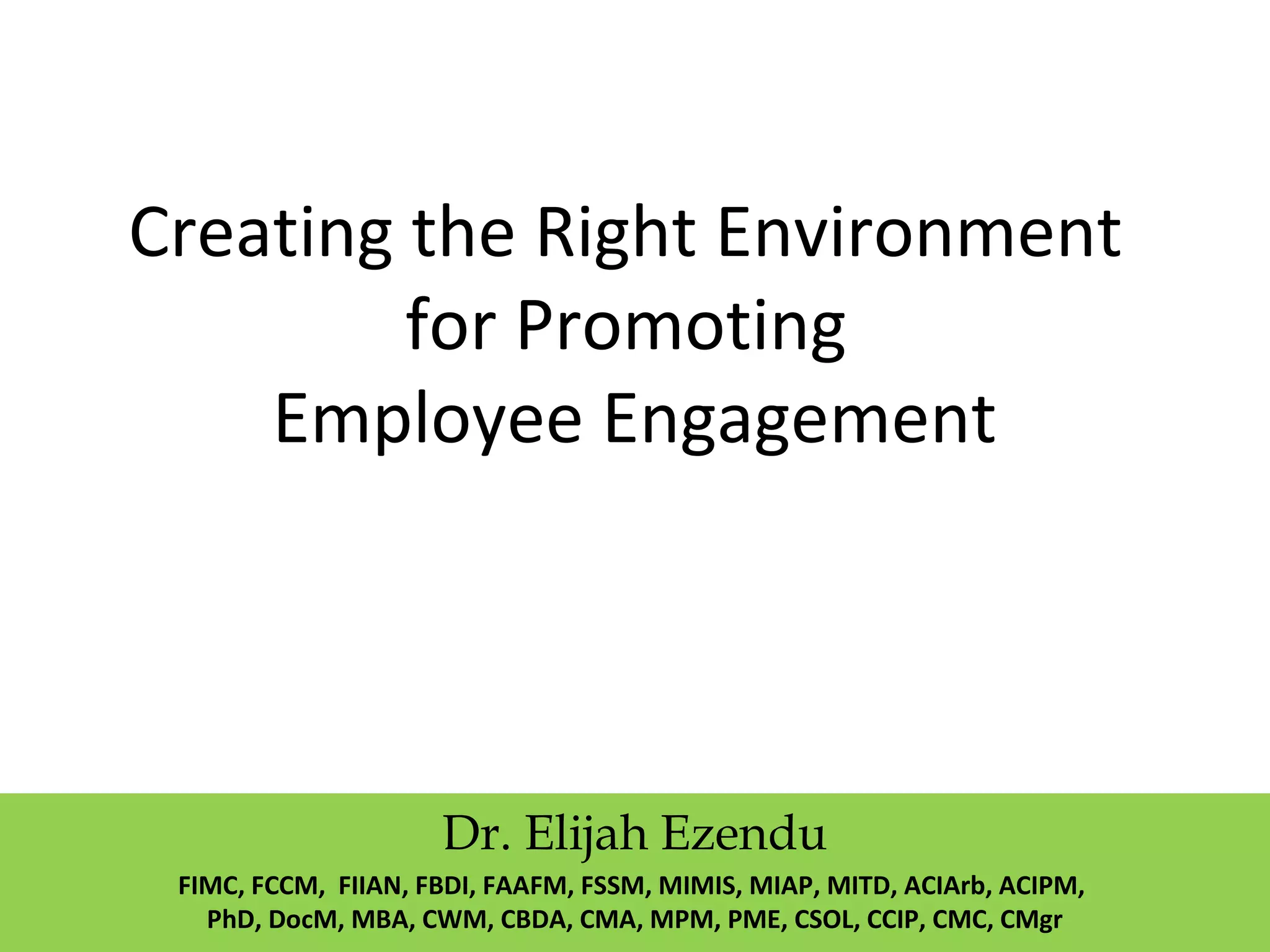 The document discusses creating the right environment to promote employee engagement. It defines employee engagement and outlines its importance for competitive advantage. It then provides frameworks and models for understanding the factors that influence engagement, including job design, leadership, psychological conditions, and roles for human resources. The document also discusses challenges in engagement and provides strategies for building passion and focus in employees through an engagement value proposition.