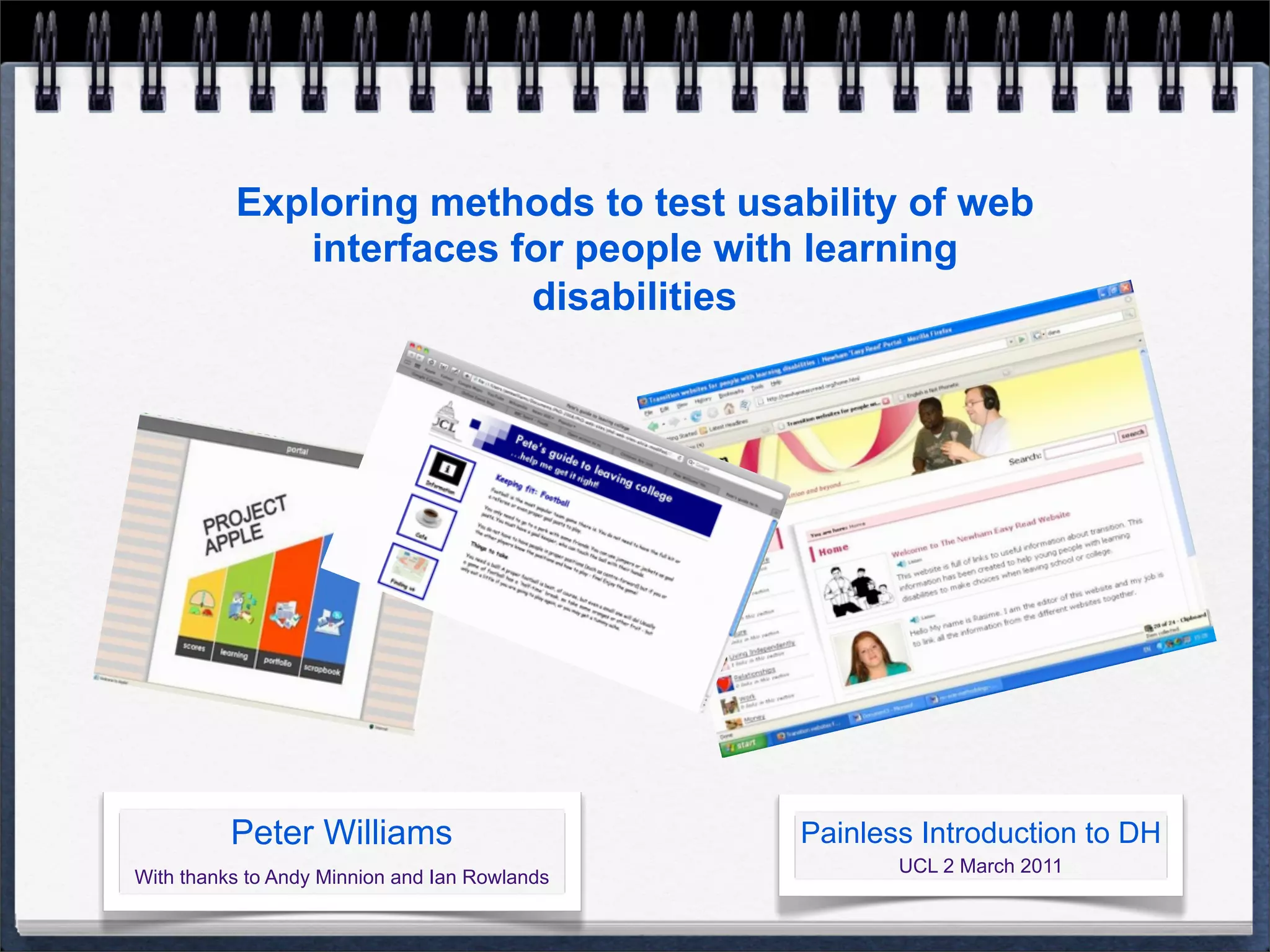 This document discusses exploring methods to test the usability of web interfaces for people with learning disabilities. It describes a two-part study: Part one involved individual studies to elicit usability issues people with learning disabilities experience. Part two compared different website designs to determine which interface factors best facilitated information retrieval and were preferred. The goal was to identify an optimal website design for people with learning disabilities.