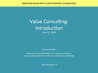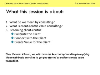 The document outlines a client-centric consulting approach introduced by Rona Puntawe, focusing on creating value through proper calibration, connection with clients, and delivery of meaningful outcomes. It emphasizes the importance of understanding client perspectives and relationships, providing techniques for effective consulting practices. Key components include establishing trust, delivering insights, and aligning intentions with desired outcomes.