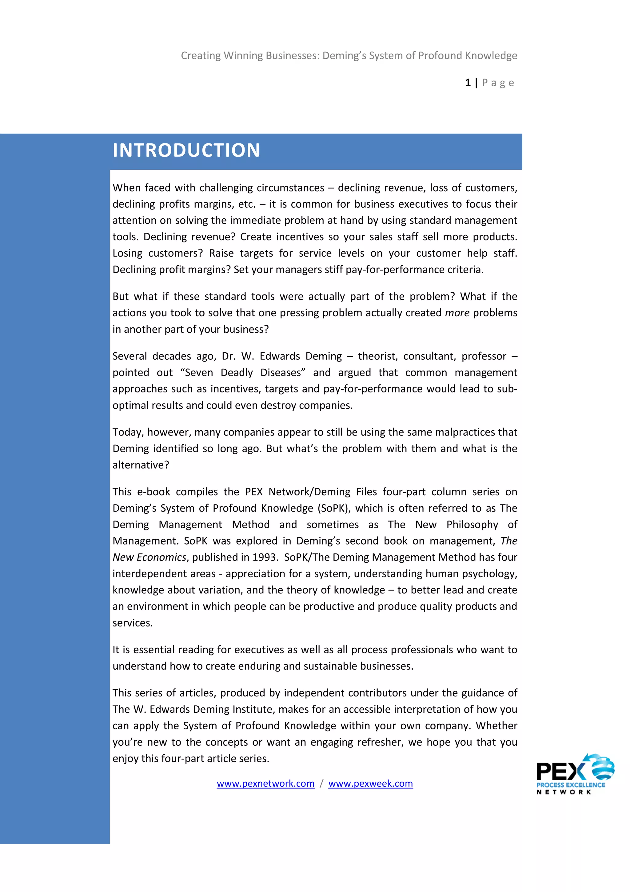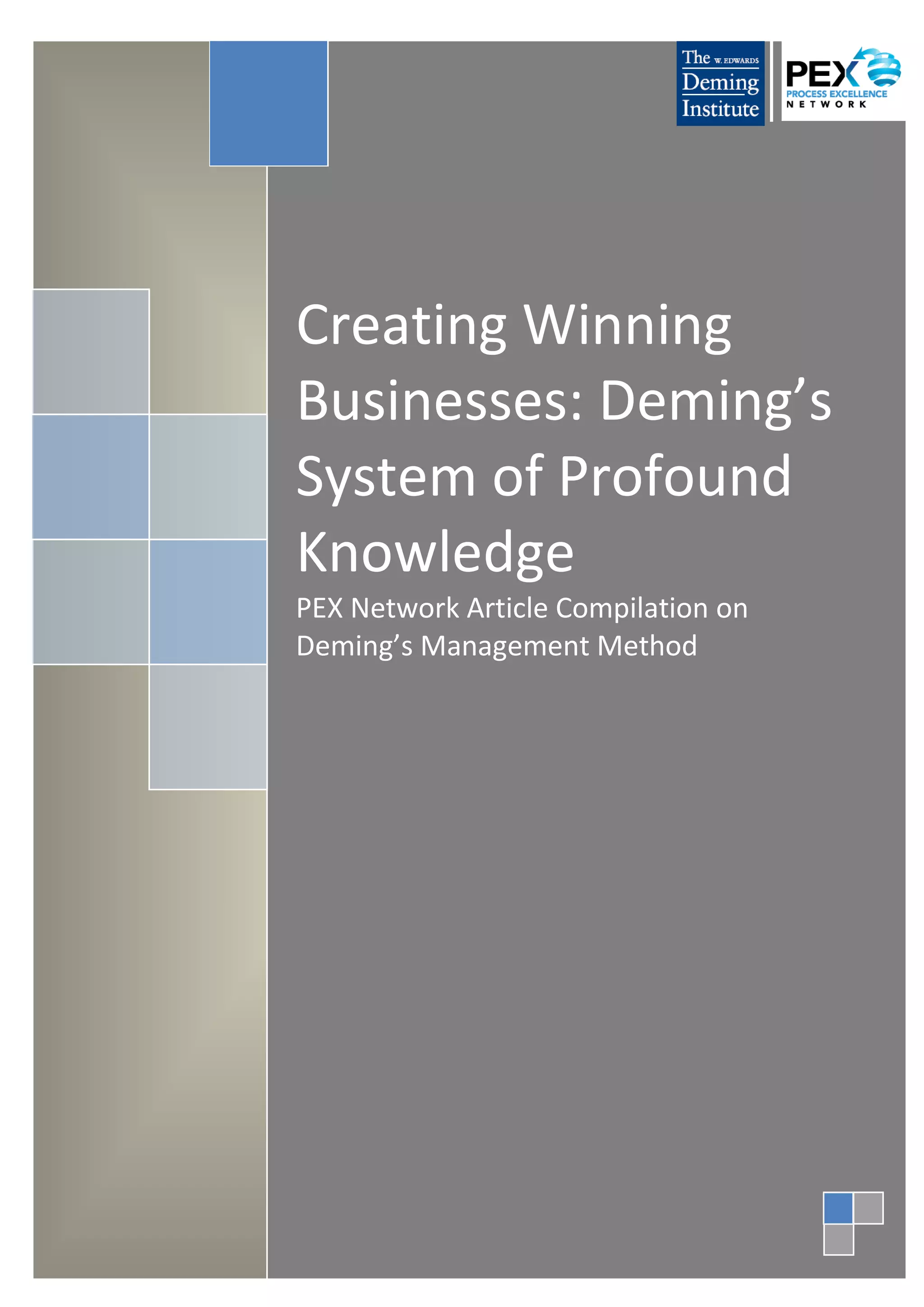 This document discusses Deming's system of profound knowledge and systems thinking. It begins by introducing Deming's work identifying common management practices that can destroy companies, such as incentives and pay-for-performance targets. It then discusses the importance of systems thinking and having a clear organizational aim. Examples of effective aims from well-known companies are provided. The document argues that committed individuals and a shared vision are needed to enact systems thinking. It also discusses forces that can destroy a system, such as extrinsic motivation and competition between groups. Finally, it advocates using flow diagrams rather than traditional organizational charts to help individuals understand how their work fits within and impacts the larger organizational system.