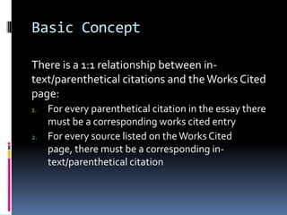 This document provides instructions for creating a Works Cited page using MLA format. It explains that there must be a one-to-one correspondence between parenthetical citations in the essay and entries in the Works Cited page. The Works Cited page should begin on a new page after the essay, use a centered title, and list entries alphabetically by author's last name. Basic entry formats are provided for different source types including books, articles from anthologies or journals, newspaper articles, websites, and more. Help resources for creating Works Cited pages are also listed.