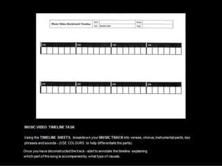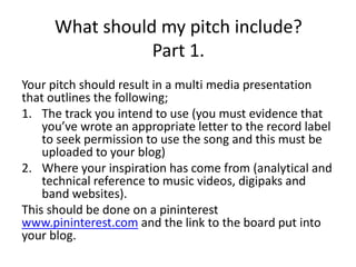 The document outlines the requirements for creating a music video pitch, which should include: 1) Details on the track being used and permission from the record label (in a letter uploaded to a blog); inspiration from other music videos, packaging, and websites pinned on Pinterest and linked in the blog. 2) A synopsis and timeline outlining what would be shot for the music video. 3) Flat plan designs for a 6-panel digipak and all pages of a website promoting the track. Students are instructed to include all content in appropriately titled blog posts and link them in a Prezi pitch to present to the class by the following week, gathering feedback to incorporate improvements.