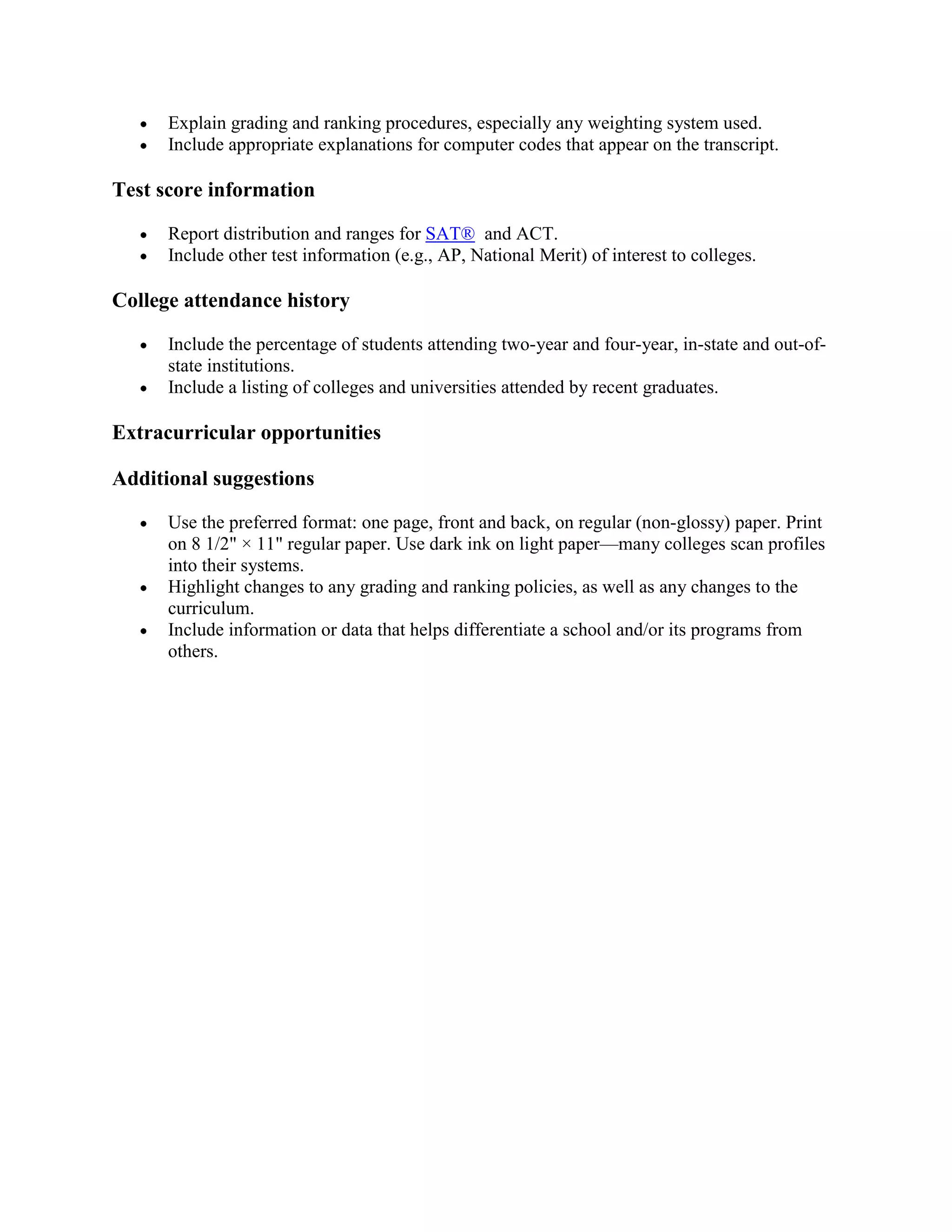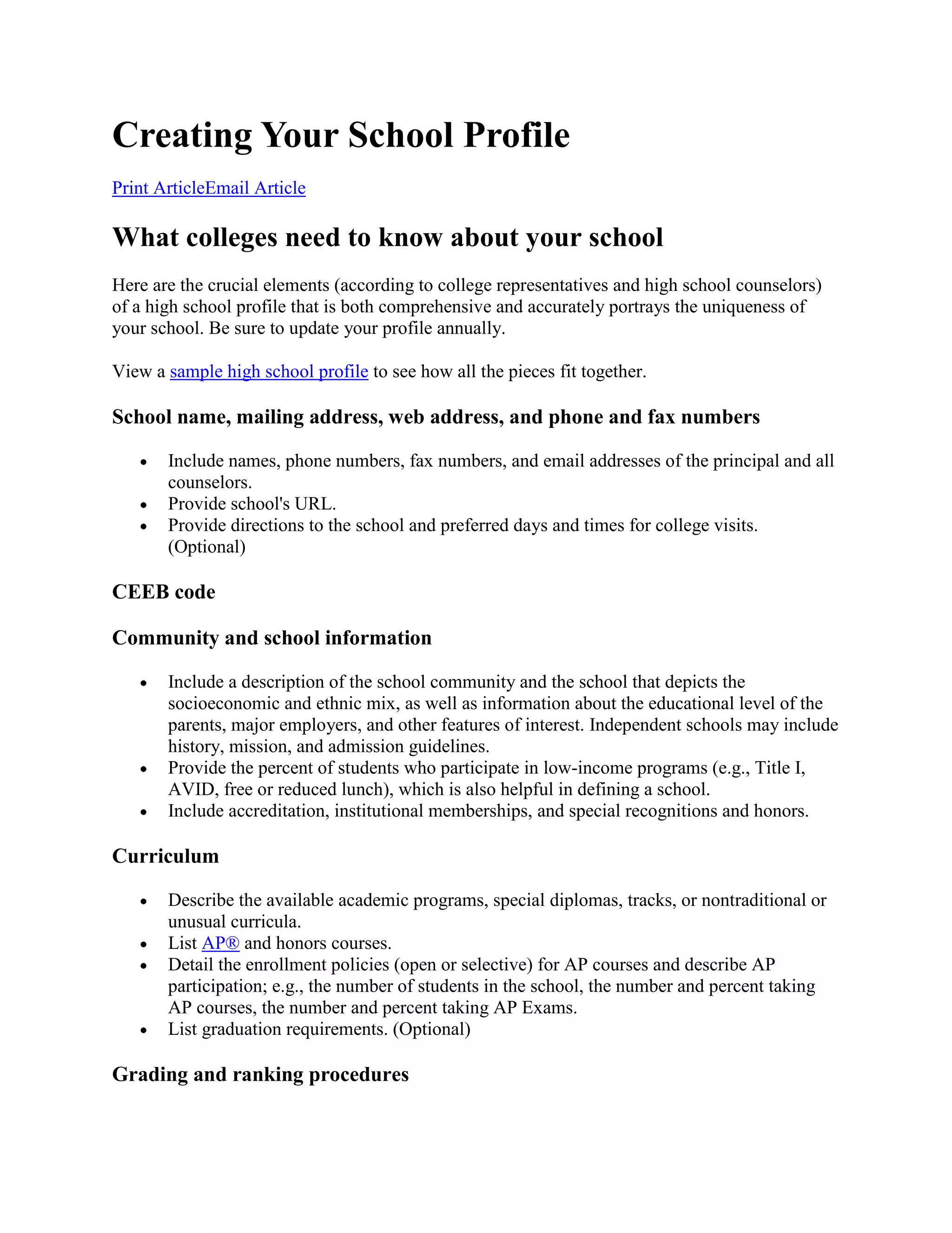 This document provides guidance on the key elements that should be included in a high school profile to accurately portray the school to colleges. It recommends including contact information, community and school details, curriculum information, grading procedures, test score data, college attendance history, extracurricular opportunities, and formatting suggestions. An effective profile comprehensively describes the school's academic programs, student demographics, and achievements in a standardized one-page format to help colleges evaluate applicants.