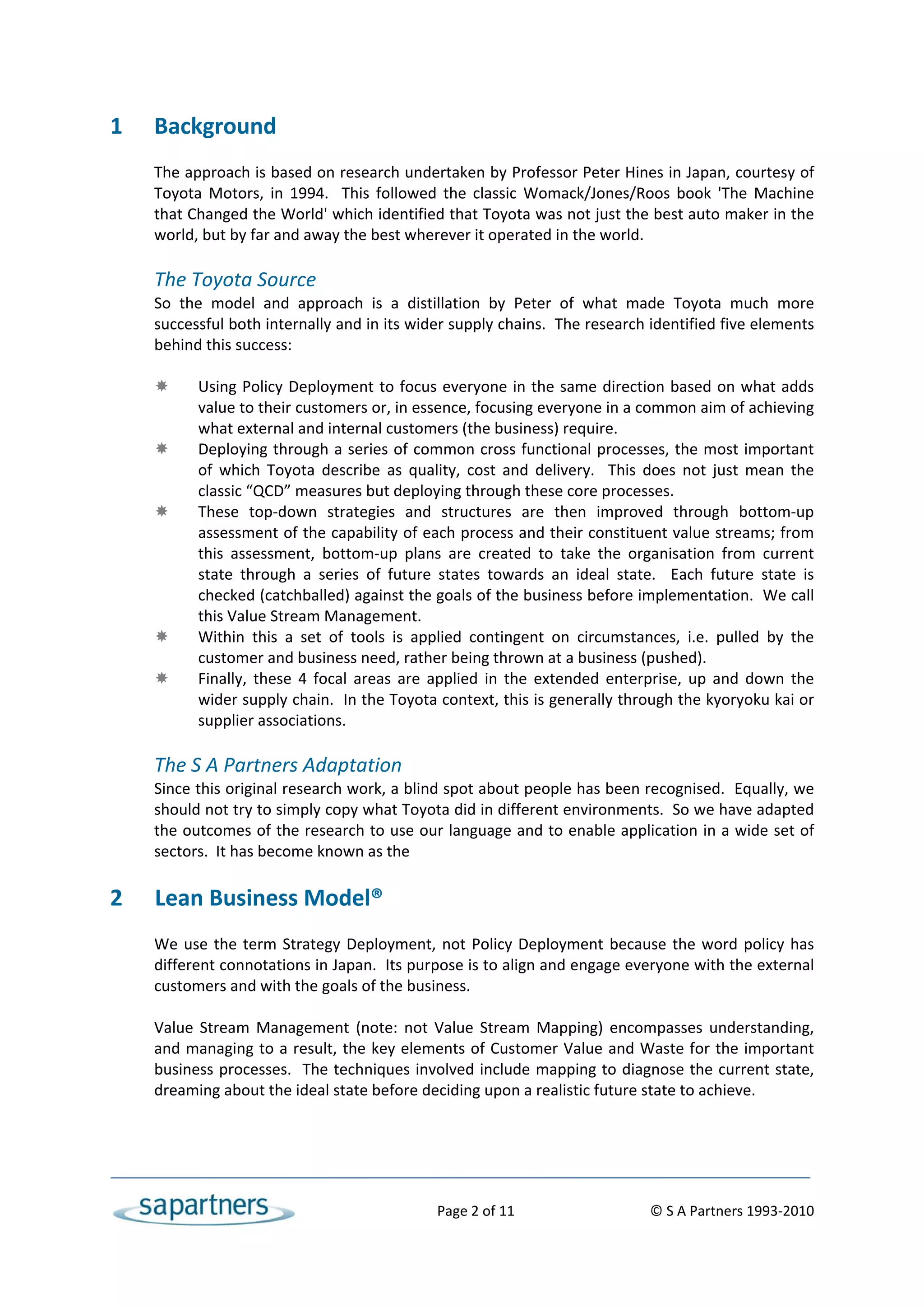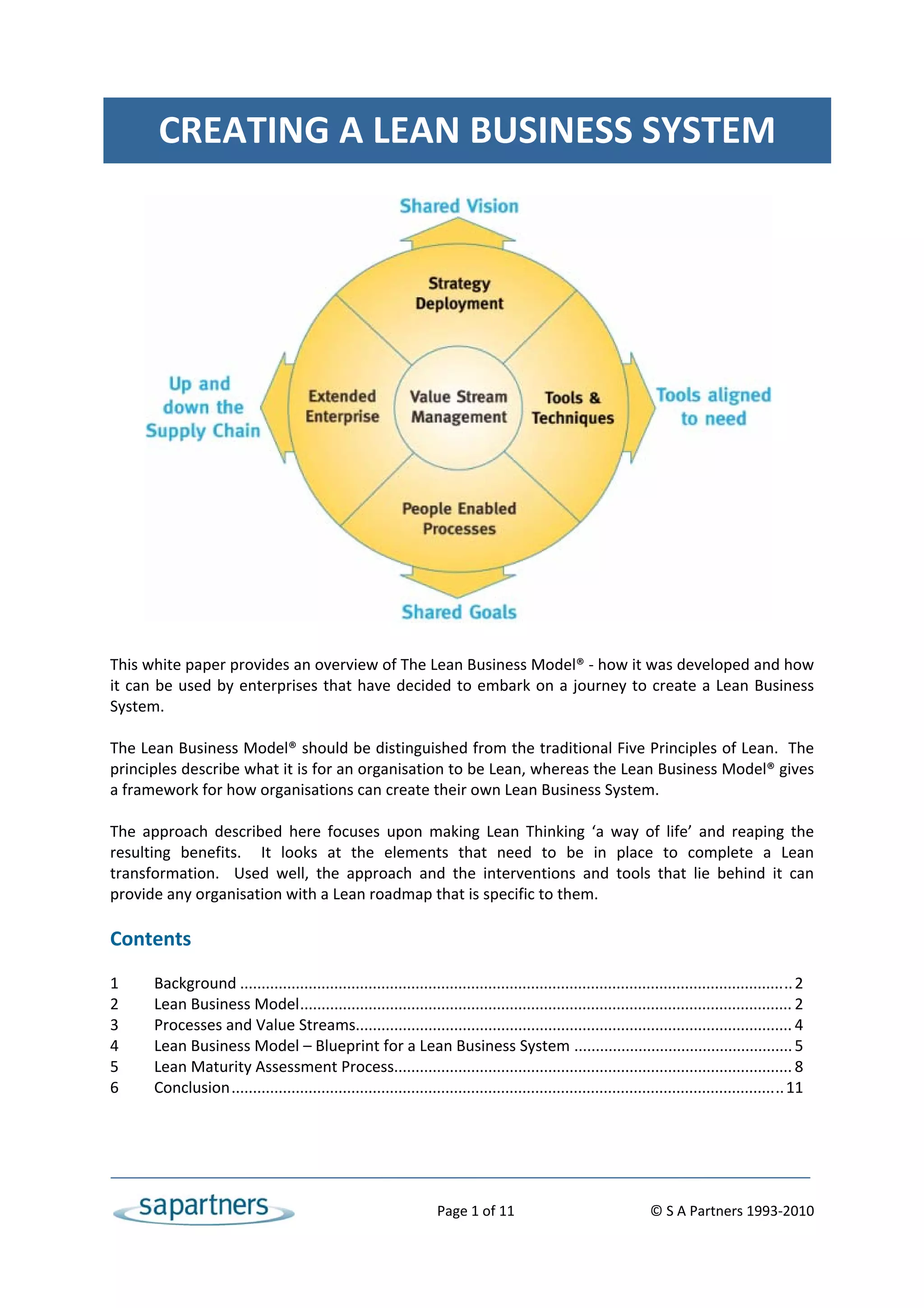 The document provides an overview of the Lean Business Model, which was developed based on research of Toyota's practices. The model gives organizations a framework for creating their own Lean Business System. It focuses on making Lean Thinking a way of life and identifies the key elements needed for a successful Lean transformation, including strategy deployment, value stream management, tools and techniques, people-enabled processes, and extending Lean thinking throughout the supply chain. The Lean Business Model serves as both a blueprint for creating a Lean system and a basis for assessing an organization's Lean maturity.