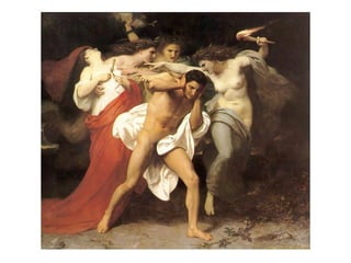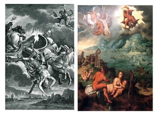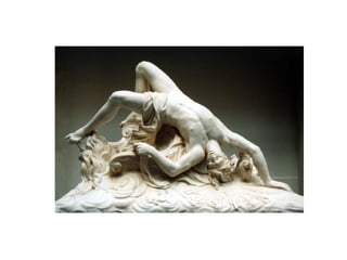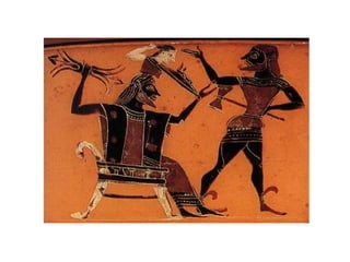 Hesiod's account of creation is summarized in three murals. The first shows Cronus castrating Uranus and the birth of Aphrodite from the severed genitals. The second depicts Zeus being raised in secret on Mt. Dikte to avoid being eaten by Cronus. The third shows the marriage of Zeus and Hera, with Zeus grabbing Hera's breast.