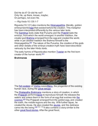 Hinduism contains various accounts of creation that are sometimes contradictory. The earliest text, the Rigveda, describes Purusha as the primeval cosmic being whose body parts were used to create different aspects of the world. It also mentions Hiranyagarbha, interpreted as either a mundane egg or a male-female energy, from which the gods and other beings were born. Later texts provide additional details on Prajapati and other gods involved in the creation, but acknowledge that the exact origins may never be known for certain.