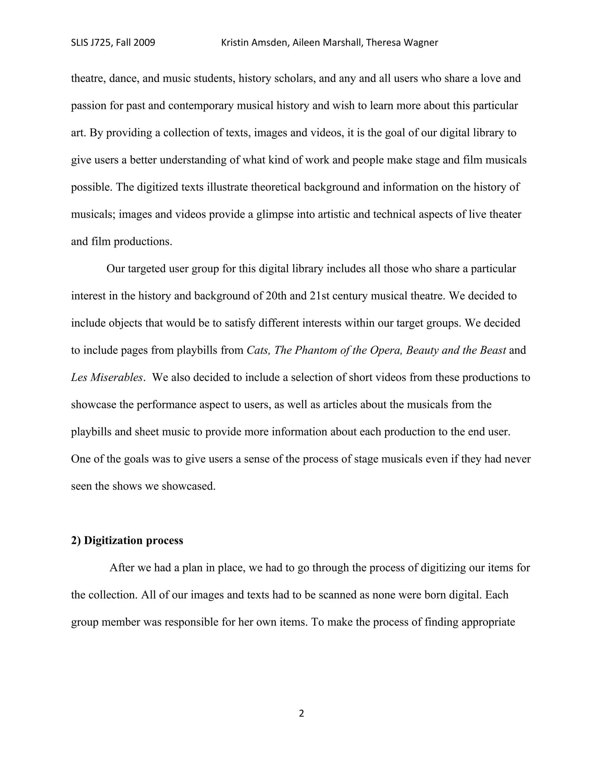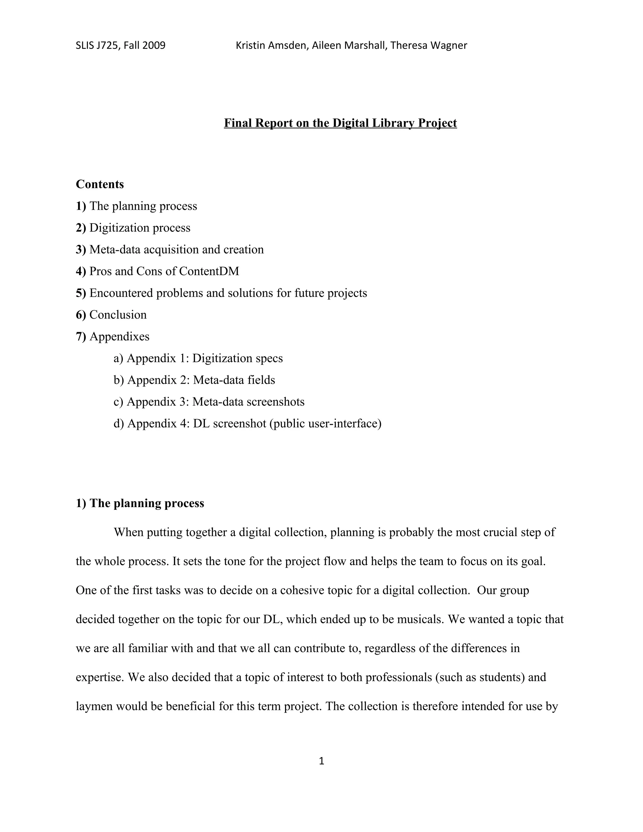 The document provides details about the planning, creation, and evaluation of a digital library project on musicals created by three students. It describes the planning process for selecting materials and intended users. Digitization and metadata processes are outlined, with ContentDM chosen as the platform. Pros of ContentDM included its user support and customization options, while problems encountered included technical compatibility issues. Lessons for future projects include appointing a group leader for coordination and clarifying roles and responsibilities.