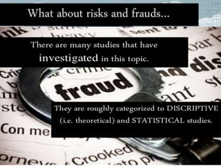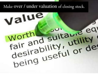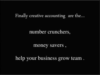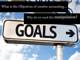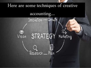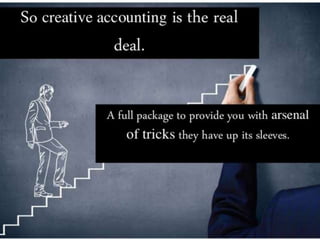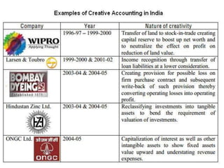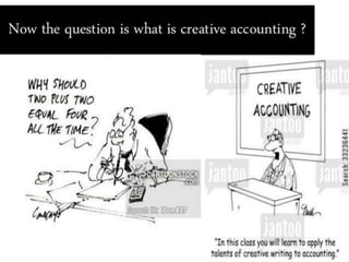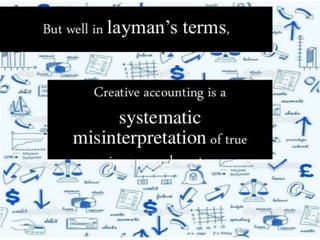 This document provides learning objectives and an overview of creative accounting. It discusses the meaning of creative accounting as imaginative ways to present accounts that deviate from the spirit of accounting laws but are not illegal, with the aim of making a company appear financially healthier. Examples of creative accounting in India are given. While creative accounting is not the same as falsifying financial statements, it is seen in a similar light. References for further information are provided.