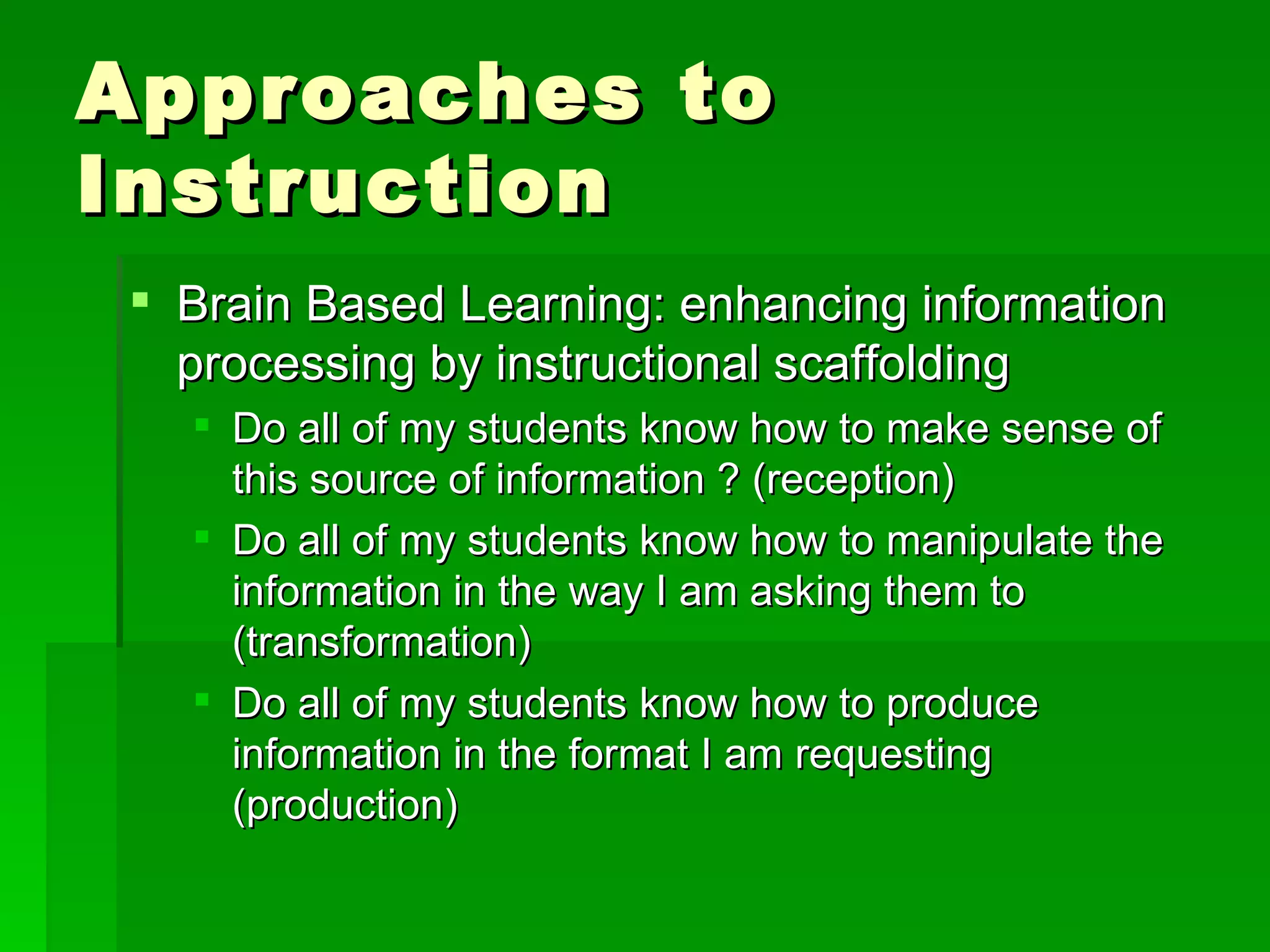The document discusses different approaches to instructional design including brain-based learning, scaffolding, and inquiry-based learning. Brain-based learning aims to enhance how students process information by providing instructional support. Scaffolding involves providing just enough support to address most student needs and gradually reducing support as skills develop. Inquiry-based learning shifts the focus from finding right answers to seeking resolutions to issues, and uses questions to promote critical thinking rather than just recall. It treats students as knowledge builders rather than just recipients of information.