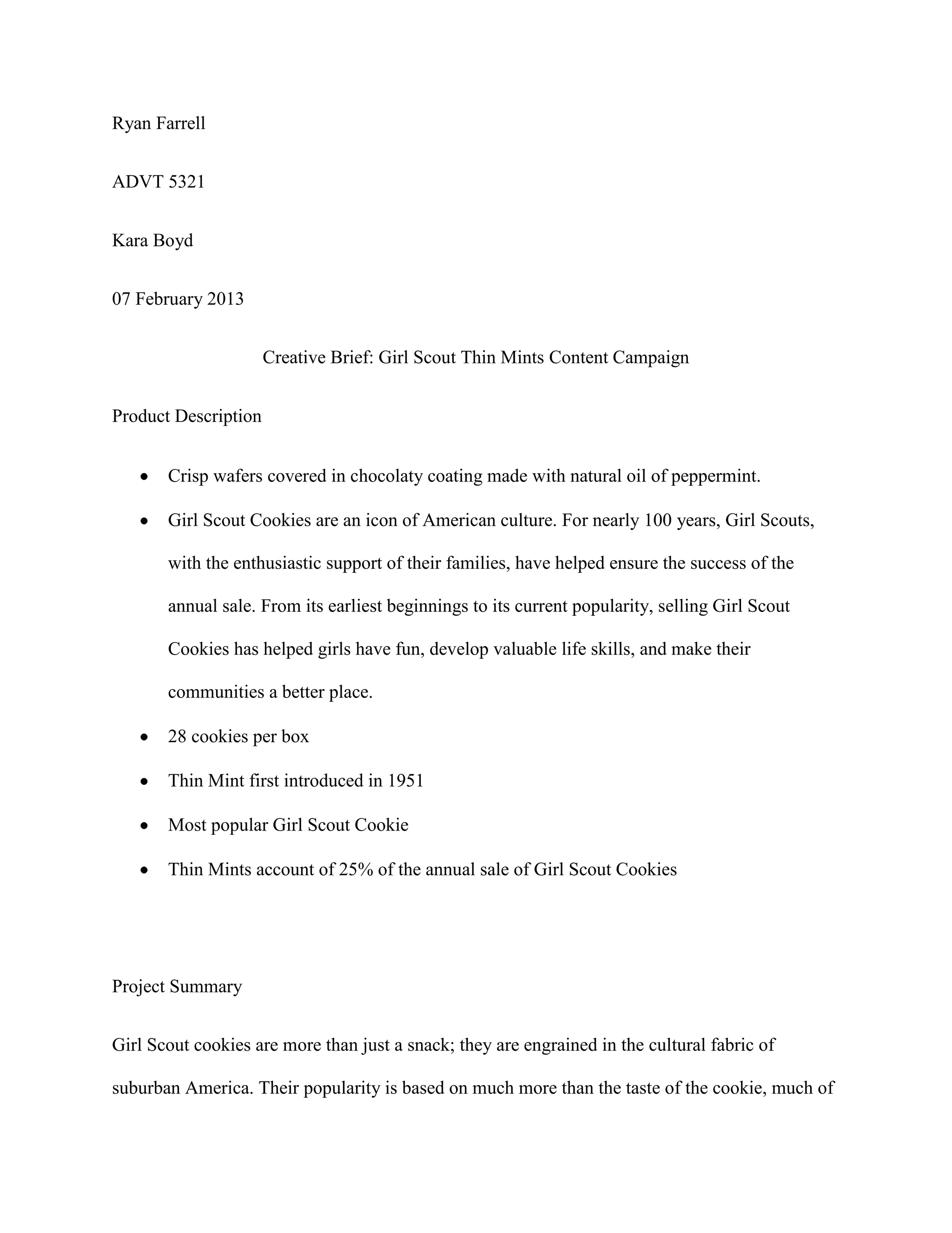 The creative brief focuses on a campaign for Girl Scout Thin Mints, aiming to reinvigorate their brand by highlighting the cookies' nostalgic appeal and community impact. The target audience is a middle-class woman in her thirties, who values family and community, and the campaign will feature engaging online videos and lifestyle content to resonate emotionally. The unique selling proposition emphasizes both the enjoyable taste of the cookies and their connection to supporting local girls, avoiding a charity-focused tone.
