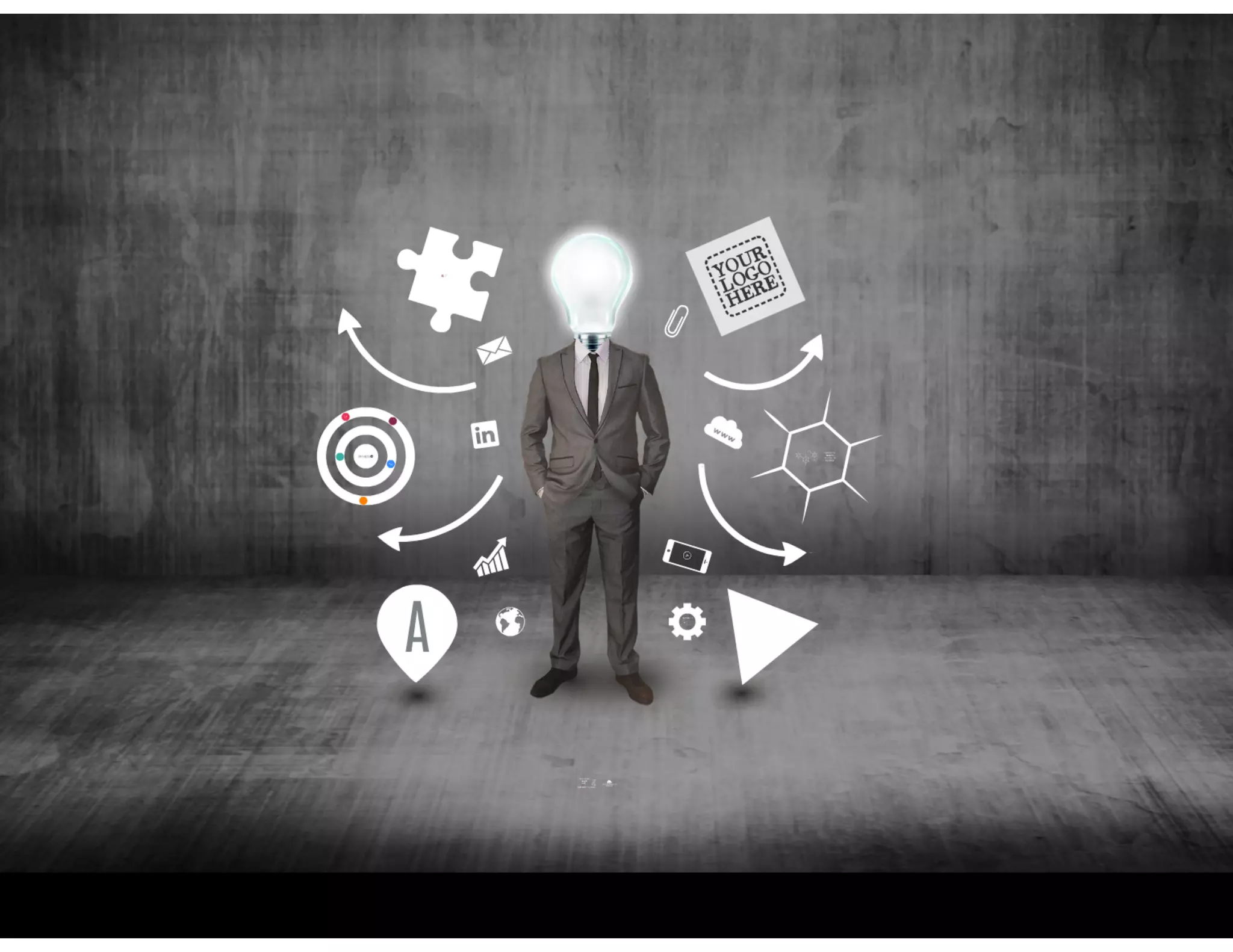 A Creative Presentation Template with a businessman in dark suit and a light bulb instead of the head. Good template for showing your ideas, presenting a company or for creative marketing. Multipurpose template with lot of customizable elements and shapes. Move the symbols around, create mind map diagram, show your plans and targets or goals. Use the puzzle pieces to illustrate how to solve problems. A universal template for showing business reports, portfolio or pitching a startup idea.