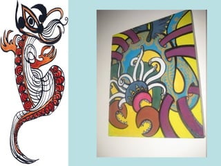 The document provides information about creating characters called taniwhas for writing and art. It discusses what taniwhas are in Maori legends, describes their appearance and abilities, and gives examples of specific taniwhas. Students are instructed to brainstorm Maori symbols and characteristics of taniwhas as they create their own taniwha character.