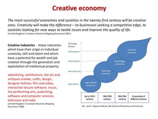 This document summarizes a study on creative cities in Latvia conducted by Alise Vitola. The study examines the relationship between creativity indicators and socioeconomic development rates and levels in 10 major Latvian cities from 2005-2009. The results show that cities with higher shares of creative class and human capital have higher socioeconomic development rates and levels, including higher income levels and lower unemployment. Specifically, cities like Ogre, Riga, and Jurmala scored highest on creativity indicators and have experienced stronger economic growth and development.