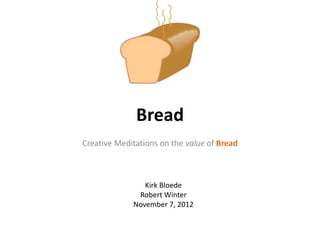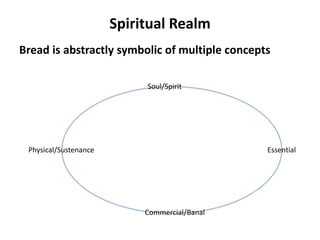 Bread is symbolically and literally valuable in several ways. Spiritually, bread represents sustenance and is symbolic in Christian religion such as being referred to as "the bread of life" in the Bible. Historically, bread is essential to life and "bread riots" have threatened political leaders when bread was scarce. Bread also represents monetary value and is referenced in language about having money. Overall, bread sustains humans physically, connects them spiritually, and symbolizes life, making the loaf of bread immensely valuable.
