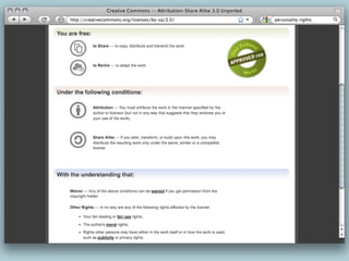 Copyright automatically arises with the creation of an original work and lasts for 70 years after the author's death, giving exclusive rights to the author. Creative Commons provides free licenses that allow creators to share their work with varying degrees of permissions, promoting legal sharing and remixing. These licenses are designed for use on the internet and enable a flexible approach to copyright that accommodates both commercial and non-commercial uses.