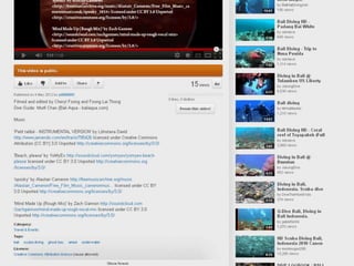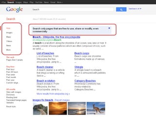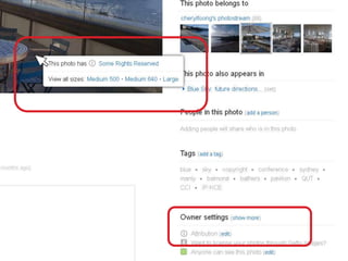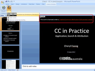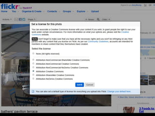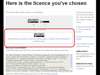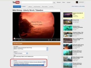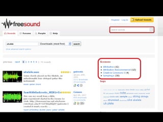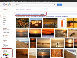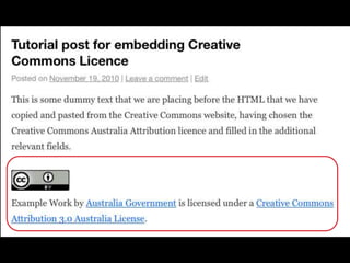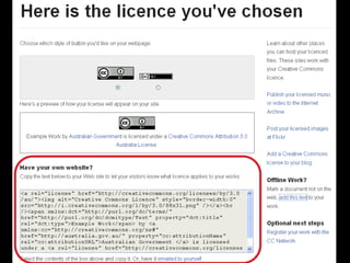 The document provides guidance on applying Creative Commons (CC) licenses to content, finding CC licensed materials, and the requirements for attributing such works. It includes resources for utilizing CC licenses, searching for images, sounds, and videos, as well as detailed attribution formats. Additionally, it discusses best practices for ensuring usage rights and effective communication of license terms to users.