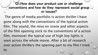 The document discusses the production of a media portfolio project focusing on an action thriller genre film. It describes integrating conventions of the genre, such as camera angles and lighting, by recreating scenes from the film Mission Impossible: Rogue Nation. The film aims to portray the social issues of violence and addiction among young adults aged 20-30. It would be distributed by Warner Bros and target audiences aged 15-40. The project helped develop the author's production skills in areas like camera work, sound design, and editing software. A variety of hardware like a Canon DSLR and DJI drone and software like iMovie were used to integrate technologies in the production.
