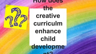 The Creative Curriculum is a early childhood curriculum that is based on child development theories and scientific research. It focuses on teacher-directed and child-initiated learning through play. The curriculum supports children's development across four domains: cognitive, physical, social/emotional, and language. It uses assessment tools to track children's progress in these areas and aligns goals and objectives to age-appropriate developmental milestones. Research shows that the Creative Curriculum effectively enhances children's learning and growth.