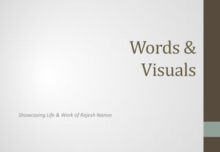 Rajesh Nanoo is a writer, poet, columnist, motivational speaker, freelance designer, art director, creative director, actor, script writer and director from Kerala, India. He has over 13 years of experience in writing and design. Some of his achievements include having columns and books published by top publishers. He has also written and directed short films and scripts for Malayalam feature films. Throughout his career, he has focused on using his creativity to uplift culture and morality. He presents concepts through words, visuals, videos, posters and other media.