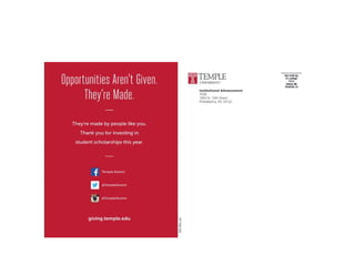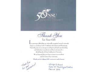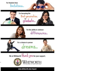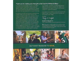 This document outlines creative donor engagement and communication strategies for nonprofit organizations. It identifies key donor segments to target, such as loyal donors and married alumni. Techniques discussed include focusing on the enduring impact of gifts rather than size, using special touches tailored to different donor populations each year, telling impactful stories, and being honest in communications. The document concludes by thanking the audience and providing contact information for further questions.