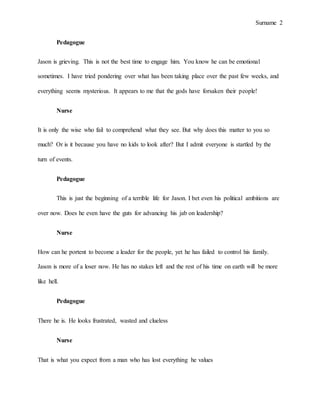 3) When Jason encounters the pedagogue and nurse, he accuses them of not stopping Medea from killing his children, showing how grief-stricken he is over the tragedy.
