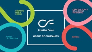 Creative Force is a marketing and events agency that specializes in organizing large-scale events, national BTL projects, PR, and digital activations for car brands. They have experience organizing test drives, tours, launches, and exhibitions for brands such as Nissan, Peugeot, Renault, Infiniti, and Datsun, reaching hundreds of thousands of people across Russia and other countries. The agency also provides business event services including conferences, product launches, and special client events.